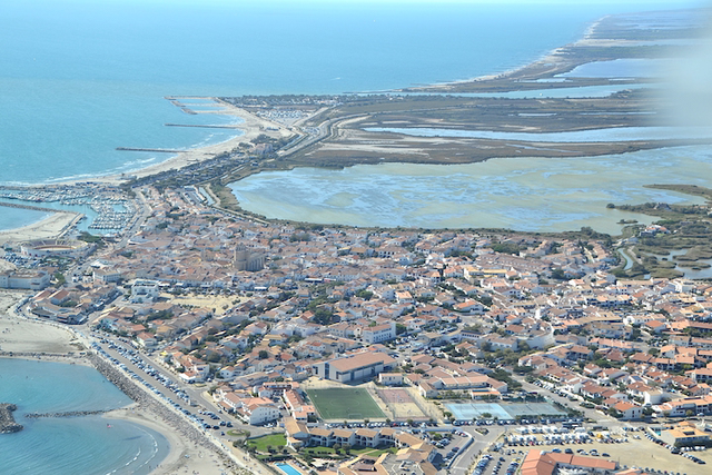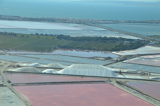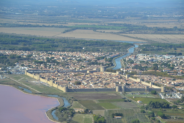 Survol des salins du Midi et des remparts d'Aigues Mortes,